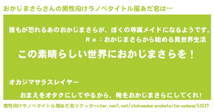 | 女子向けラノベタイトル風あだ名 | 『悪役おかじまさらに転生したようですが、知った事ではありません』 |