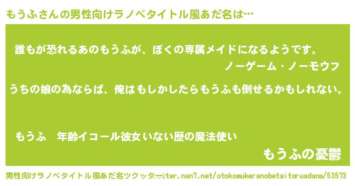 | 女子向けラノベタイトル風あだ名 | 『もうふの婚約者』『死神もうふの再婚』 |