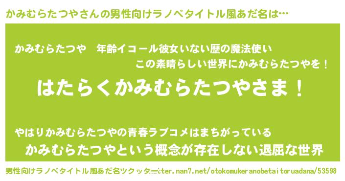 | 胡散臭い通販商品みたいなあだ名 | 『来世でも幸せになれる健康食品…その名も「かみむらたつや」』 |