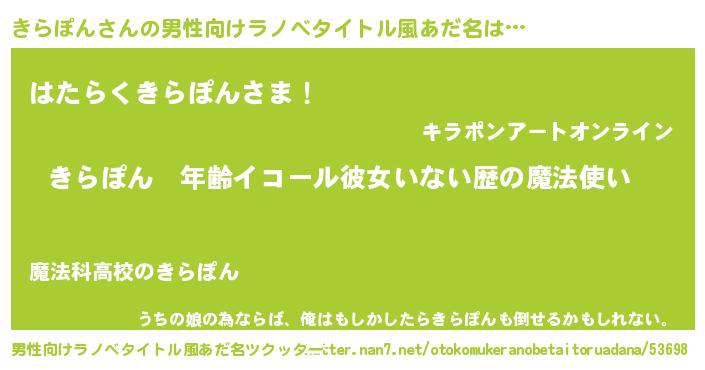 | 女子向けラノベタイトル風あだ名 | 『きらぽんの玉の輿計画!』 |