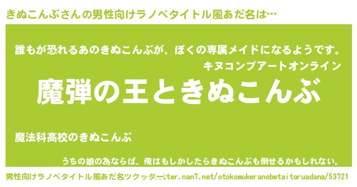 | 女子向けラノベタイトル風あだ名 | 『乙女ゲームの破滅フラグしかない悪役きぬこんぶに転生してしまった…』 |