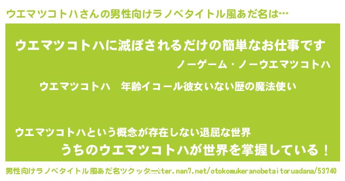 | 女子向けラノベタイトル風あだ名 | 『ウエマツコトハの玉の輿計画!』 |