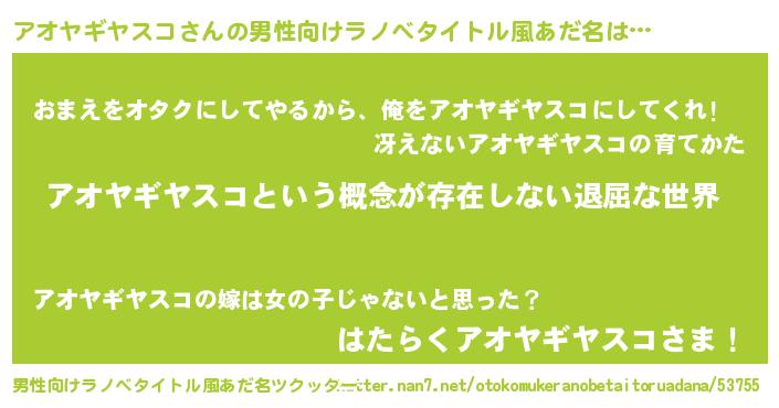 | 胡散臭い通販商品みたいなあだ名 | 『絶対に幸福をもたらす水素水…その名も「アオヤギヤスコ」』 |