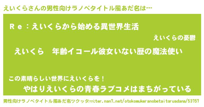 | 女子向けラノベタイトル風あだ名 | 『えいくらの玉の輿計画!』 |