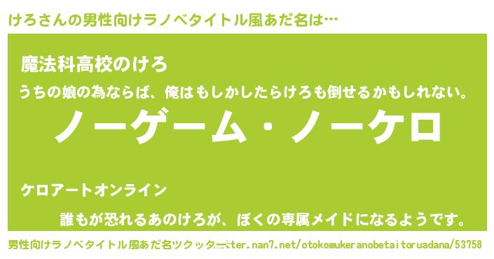 | 女子向けラノベタイトル風あだ名 | 『死神けろの再婚』『けろ伯爵の花嫁』 |