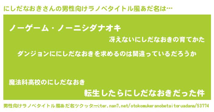 | 女子向けラノベタイトル風あだ名 | 『にしだなおきの卵を拾いまして』 |