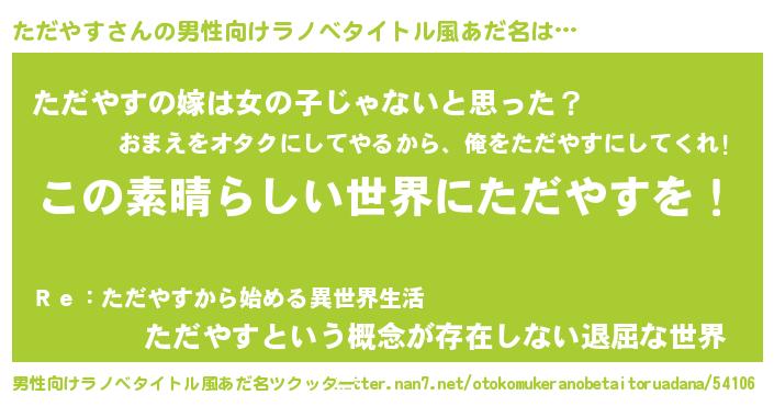 | 女子向けラノベタイトル風あだ名 | 『悪役ただやすに転生したようですが、知った事ではありません』 |