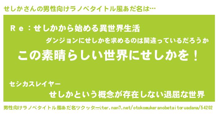 | 胡散臭い通販商品みたいなあだ名 | 『あなたにだけ特別に提供する限定10本のレアな日本酒…その名も「せしか」』 |
