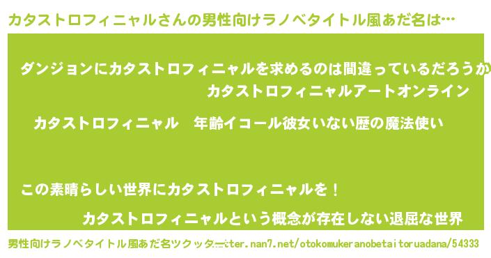 | 女子向けラノベタイトル風あだ名 | 『カタストロフィニャルの玉の輿計画!』 |