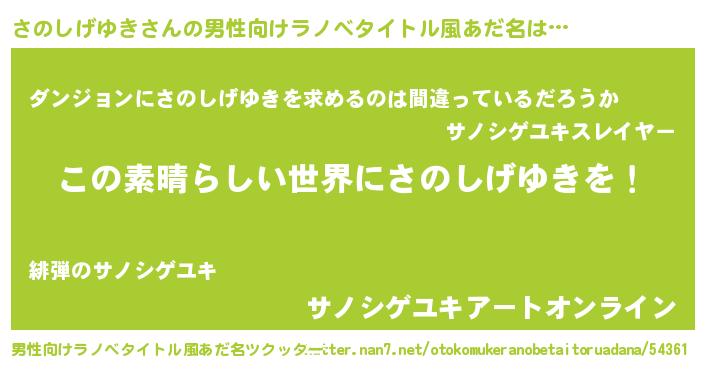 | 胡散臭い通販商品みたいなあだ名 | 『あなたにだけ特別に提供する100年もののヴィンテージワイン…その名も「さのしげゆき」』 |