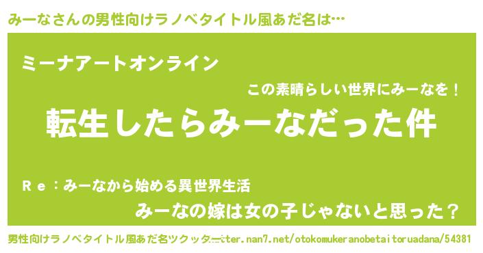 | 女子向けラノベタイトル風あだ名 | 『みーなの玉の輿計画!』『闇のみーな』 |