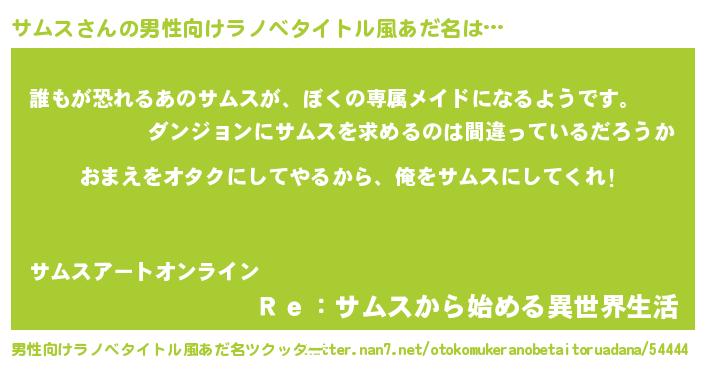 | 女子向けラノベタイトル風あだ名 | 『サムス夫妻のなれそめ』『闇のサムス』 |
