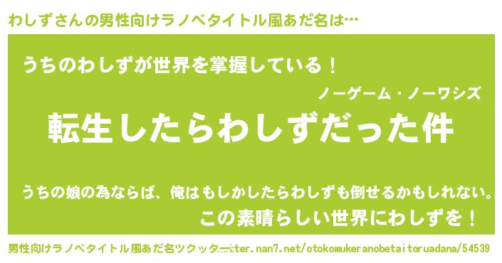 | 女子向けラノベタイトル風あだ名 | 『わしずの玉の輿計画!』 |