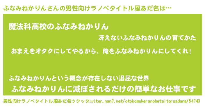 | 女子向けラノベタイトル風あだ名 | 『ふなみねかりん夫妻のなれそめ』 |