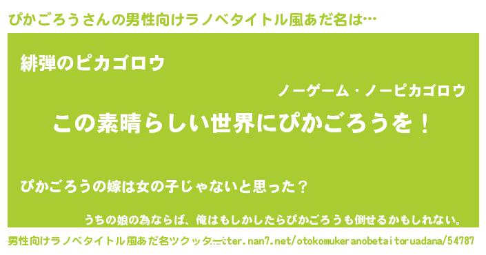 | 女子向けラノベタイトル風あだ名 | 『乙女ゲームの破滅フラグしかない悪役ぴかごろうに転生してしまった…』 |