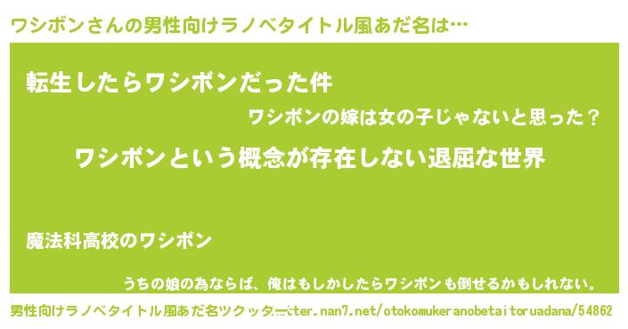 | 女子向けラノベタイトル風あだ名 | 『ワシボンの契約王妃』 |