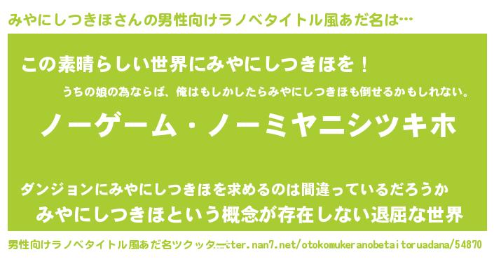 | 女子向けラノベタイトル風あだ名 | 『死神みやにしつきほの再婚』 |