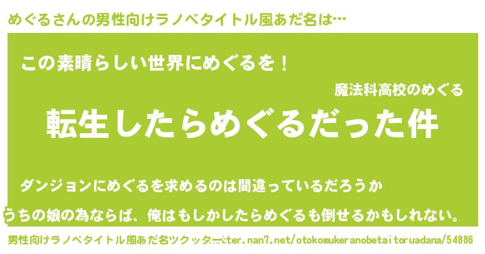 | 女子向けラノベタイトル風あだ名 | 『めぐるの玉の輿計画!』 |