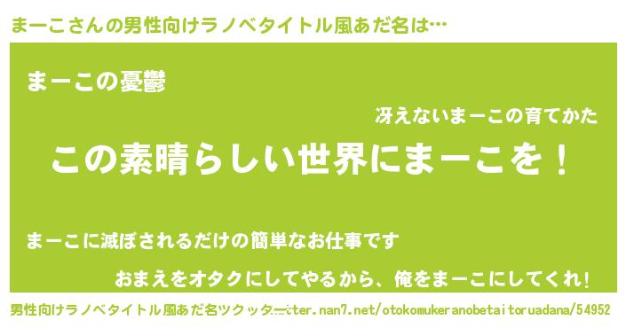 | 女子向けラノベタイトル風あだ名 | 『乙女ゲームの破滅フラグしかない悪役まーこに転生してしまった…』 |