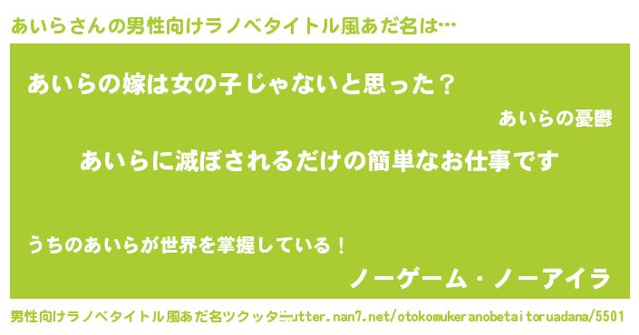 | 女子向けラノベタイトル風あだ名 | 『横柄あいらと宰相陛下』『あいら恋絵巻』 |