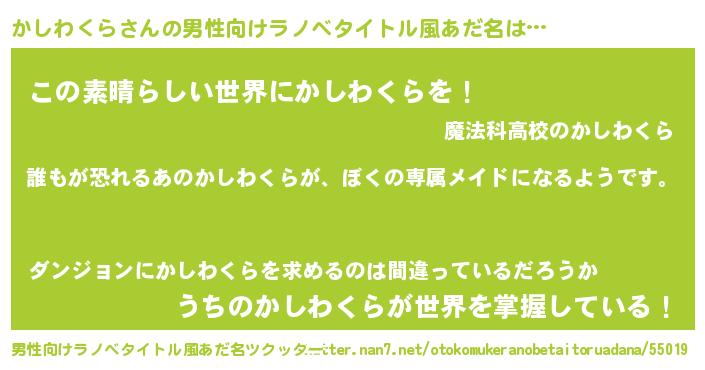 | 女子向けラノベタイトル風あだ名 | 『異世界でカフェかしわくらを開店しました。』 |