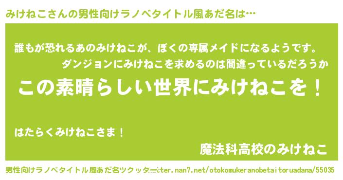 | 女子向けラノベタイトル風あだ名 | 『悪役みけねこに転生したようですが、知った事ではありません』 |
