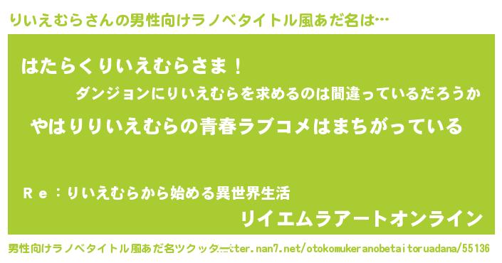 | 女子向けラノベタイトル風あだ名 | 『りいえむらの雑貨屋さん』 |