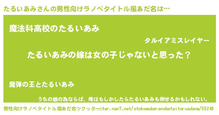 | 女子向けラノベタイトル風あだ名 | 『たるいあみの卵を拾いまして』 |