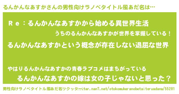 | 女子向けラノベタイトル風あだ名 | 『異世界で失敗しない100のるんかんなあすか』 |
