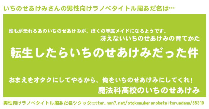 | 胡散臭い通販商品みたいなあだ名 | 『来世でも幸せになれる水素水…その名も「いちのせあけみ」』 |