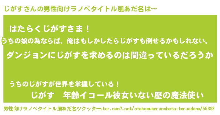 | 女子向けラノベタイトル風あだ名 | 『じがすの卵を拾いまして』 |