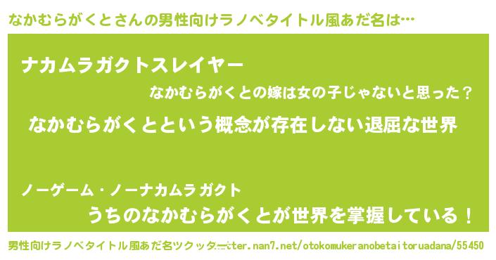 | 女子向けラノベタイトル風あだ名 | 『異世界で失敗しない100のなかむらがくと』 |