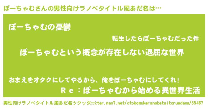 | 女子向けラノベタイトル風あだ名 | 『異世界で失敗しない100のぽーちゃむ』 |