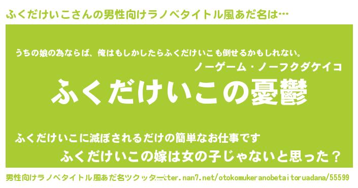 | 女子向けラノベタイトル風あだ名 | 『(仮)ふくだけいこのやんごとなき事情』 |