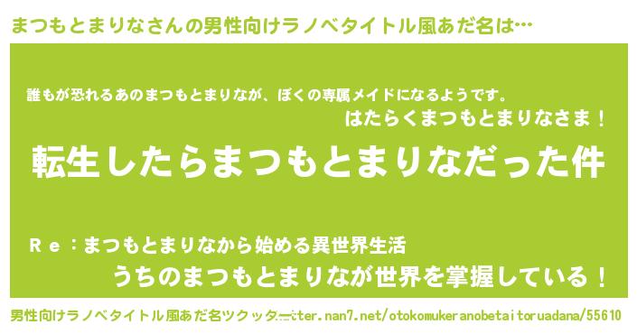 | 女子向けラノベタイトル風あだ名 | 『婚約破棄系悪役まつもとまりなに転生したので、保身に走りました。』 |