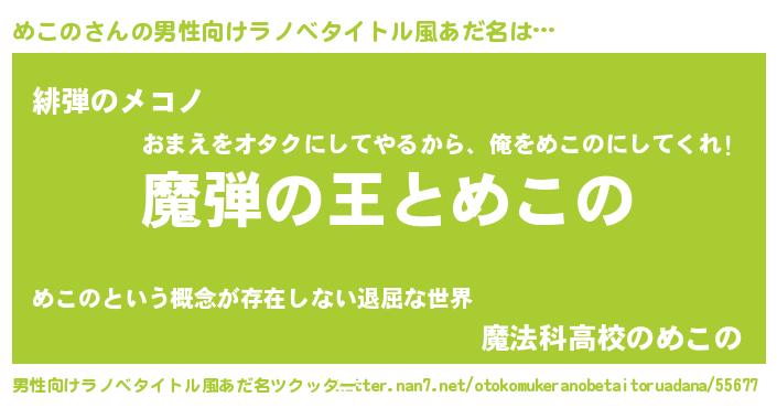 | 女子向けラノベタイトル風あだ名 | 『乙女ゲームの破滅フラグしかない悪役めこのに転生してしまった…』 |