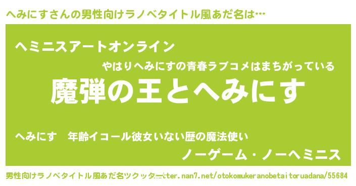 | 女子向けラノベタイトル風あだ名 | 『乙女ゲームの破滅フラグしかない悪役へみにすに転生してしまった…』 |