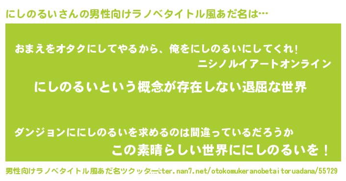 | 胡散臭い通販商品みたいなあだ名 | 『絶対に幸福をもたらす水素水…その名も「にしのるい」』 |