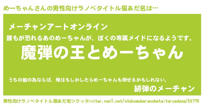 | 女子向けラノベタイトル風あだ名 | 『めーちゃんが死なない童話 林檎のめーちゃんの診療簿』 |