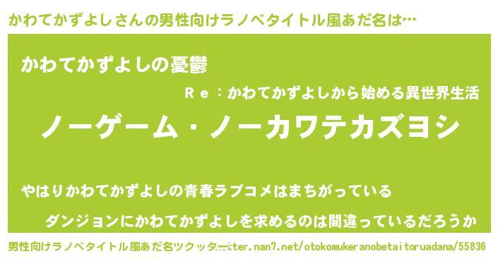 | 女子向けラノベタイトル風あだ名 | 『死神かわてかずよしの再婚』 |
