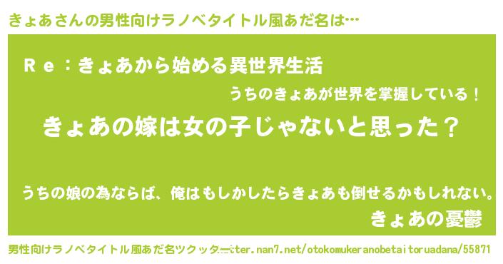 | 女子向けラノベタイトル風あだ名 | 『きょあの卵を拾いまして』 |
