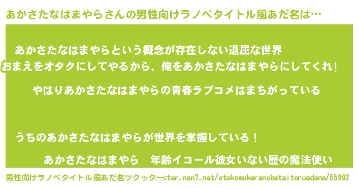 | 女子向けラノベタイトル風あだ名 | 『あかさたなはまやらの雑貨屋さん』 |