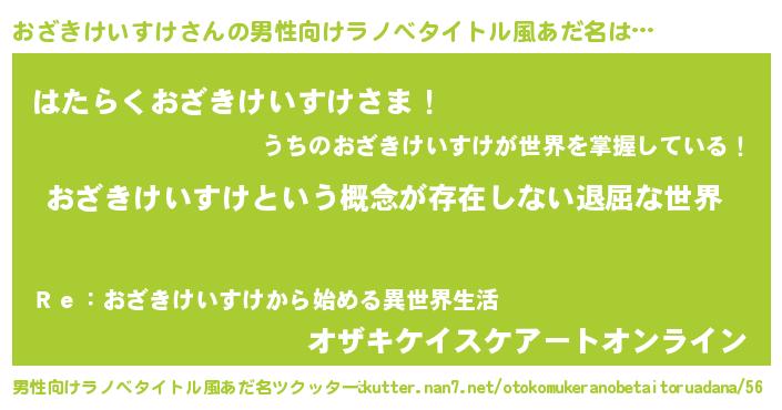 | 女子向けラノベタイトル風あだ名 | 『異世界で失敗しない100のおざきけいすけ』 |