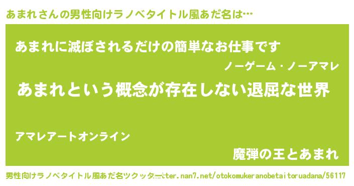 | 女子向けラノベタイトル風あだ名 | 『異世界で失敗しない100のあまれ』 |