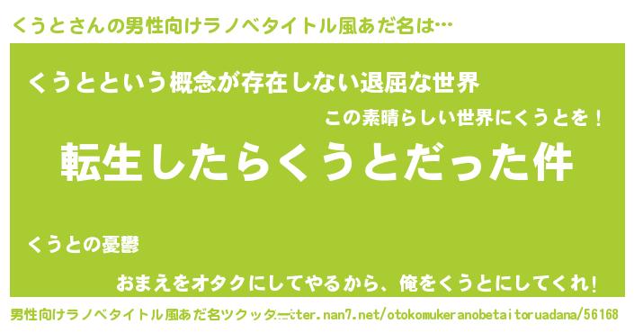 | 胡散臭い通販商品みたいなあだ名 | 『来世でも幸せになれる健康食品…その名も「くうと」』 |