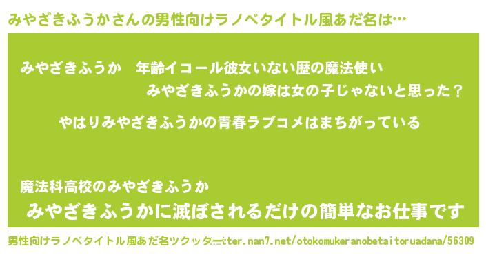 | 女子向けラノベタイトル風あだ名 | 『みやざきふうか伯爵の花嫁』 |