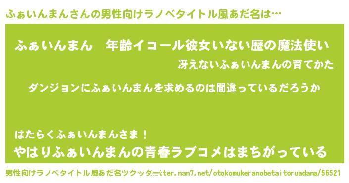 | 女子向けラノベタイトル風あだ名 | 『ふぁいんまんの卵を拾いまして』 |