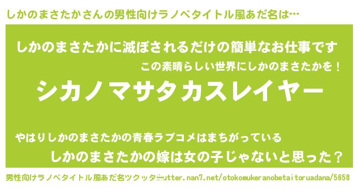 | 胡散臭い通販商品みたいなあだ名 | 『信頼と実績のサプリメント…その名も「しかのまさたか」』 |