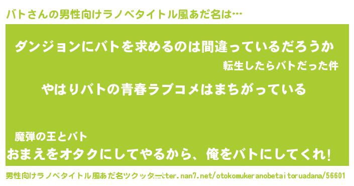 | 女子向けラノベタイトル風あだ名 | 『バトの雑貨屋さん』『バト恋絵巻』 |