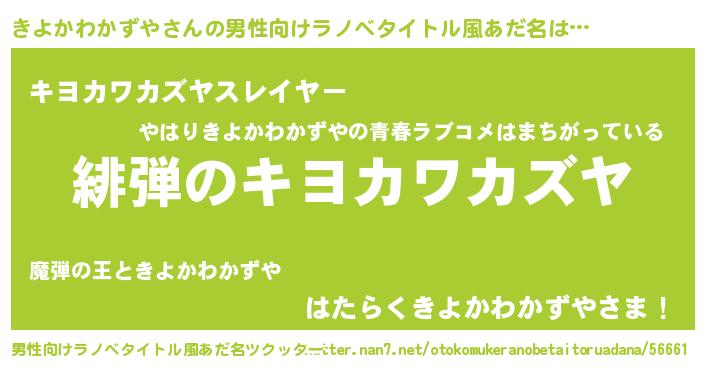 | 女子向けラノベタイトル風あだ名 | 『シンデレラきよかわかずや家の靴箱館』 |